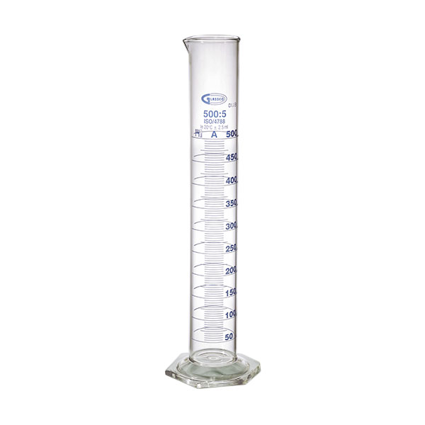 Professionel GLASSCO målecylinder klasse A fremstillet i borosilikatglas 3.3 (ASTM E438 TYPE 1). Målecylinderen har hexagonal (sekskantet) base, som giver ekstra stabilitet under laboratoriearbejde. Velegnet til præcise volumenmålinger i laboratorier, industri og undervisning.