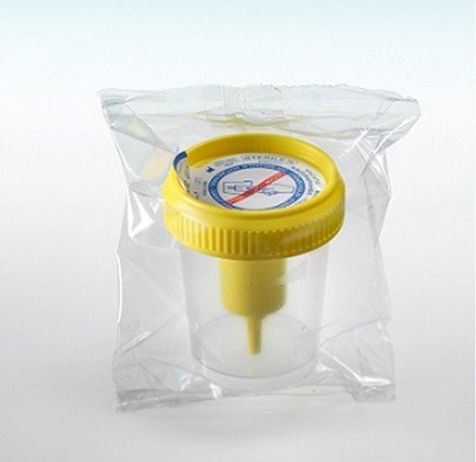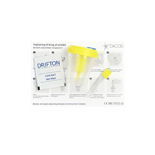 Urinprøvekit vakuum er sterilt og indeholder et urinbæger og et opsamlingsrør. Både bæger og rør leveres med påmonterede låg og pakket sætvis i steril indpakning.